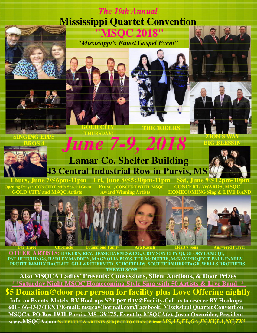 19th Annual Mississippi Quartet Convention scheduled for June 7-9, 2018 at the Lamar Co. Fairground’s Shelter Building in Purvis, MS.  The 3 day Gospel music convention will feature over 30 Artists from the states of MS, AL, FL, GA, IN, KY, LA, NC, TN, and TX. The Award winning artist “Gold City” will be performing on the Thursday night June 7th of the Mississippi Quartet Convention. Each night will feature non-stop music, concessions, silent auctions, door prizes and Saturday evening will host the MSQC Homecoming Sing (gaither style) with Live Band. RV Hookups available $20 per day, must register through us at 601-466-4343. No Ticket needed, asking for a $5 at Door Donation (for facility cost) and a love offering will be taken each night. Please bring your family and church friends. For any other questions feel free to call or text 601-466-4343 or visit our facebook page: Mississippi Quartet Convention.