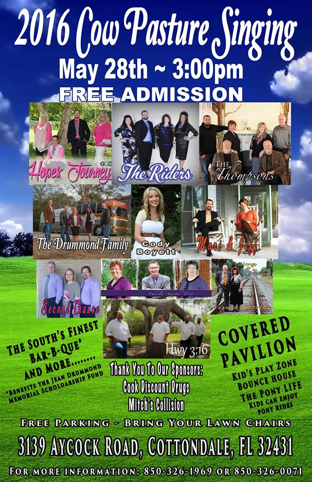 2016 Cow Pasture Singing April 18, 2016 By SGN Scoops Staff 2016 Cow Pasture Singing 2016 Cow Pasture Singing May 28th Call For More Information 850 326 1969 or 850 326 0071 Share this: Click to share on Facebook (Opens in new window) Facebook Click to share on X (Opens in new window) X Click to share on Pinterest (Opens in new window) Pinterest Click to email a link to a friend (Opens in new window) Email Related