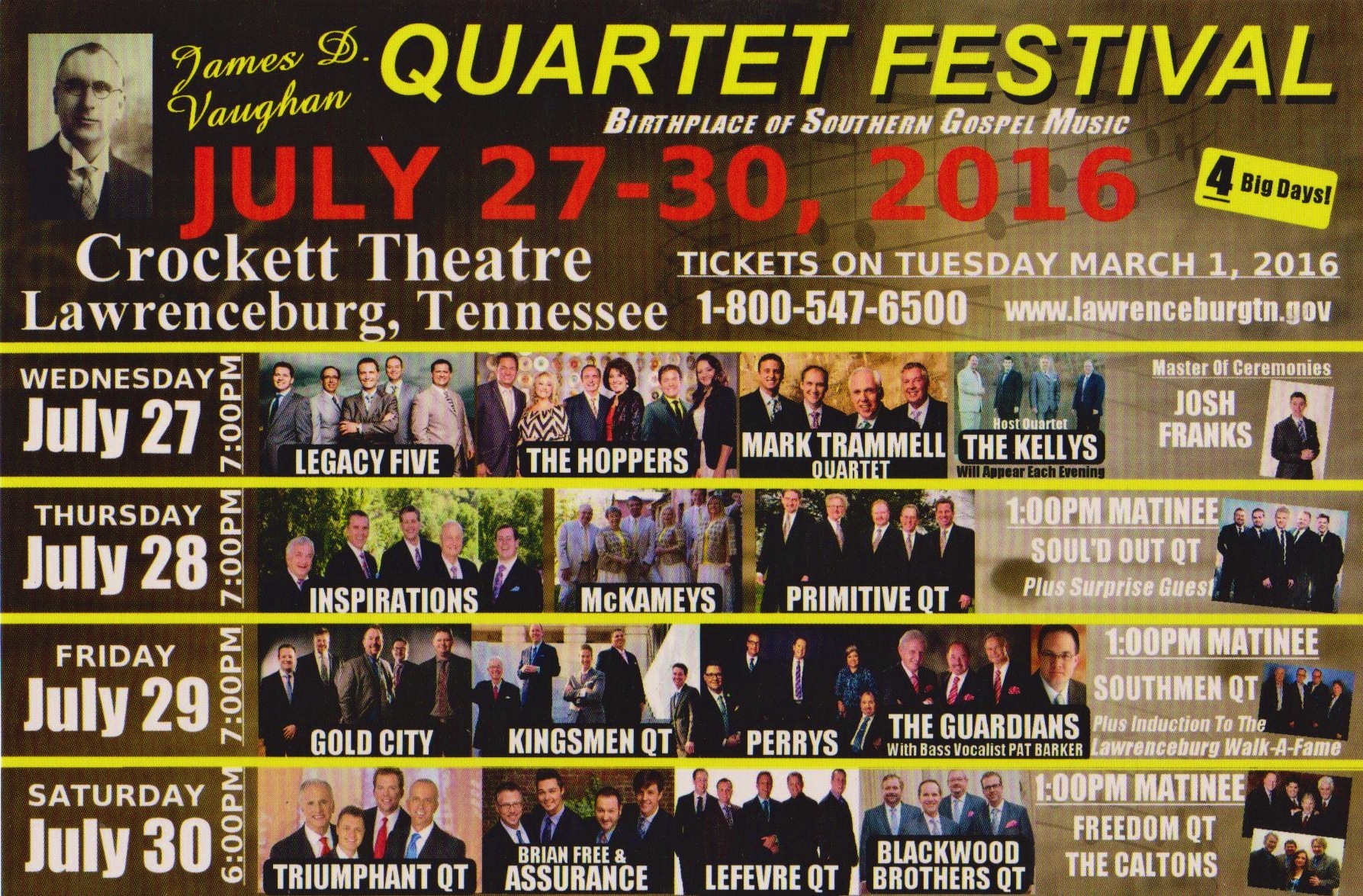 Host Quartet and Lawrenceburg’s own, the Kellys will appear each evening. Josh Franks will be the MC for the entire festival. The Vaughan Quartet Festival will once again be held at the historic Crockett Theater. Tickets go on sale on Tuesday, March 1 at 10:00AM. For more information or tickets call 1-800-547-6500. You may also order your tickets online at www.lawrenceburgtn.gov