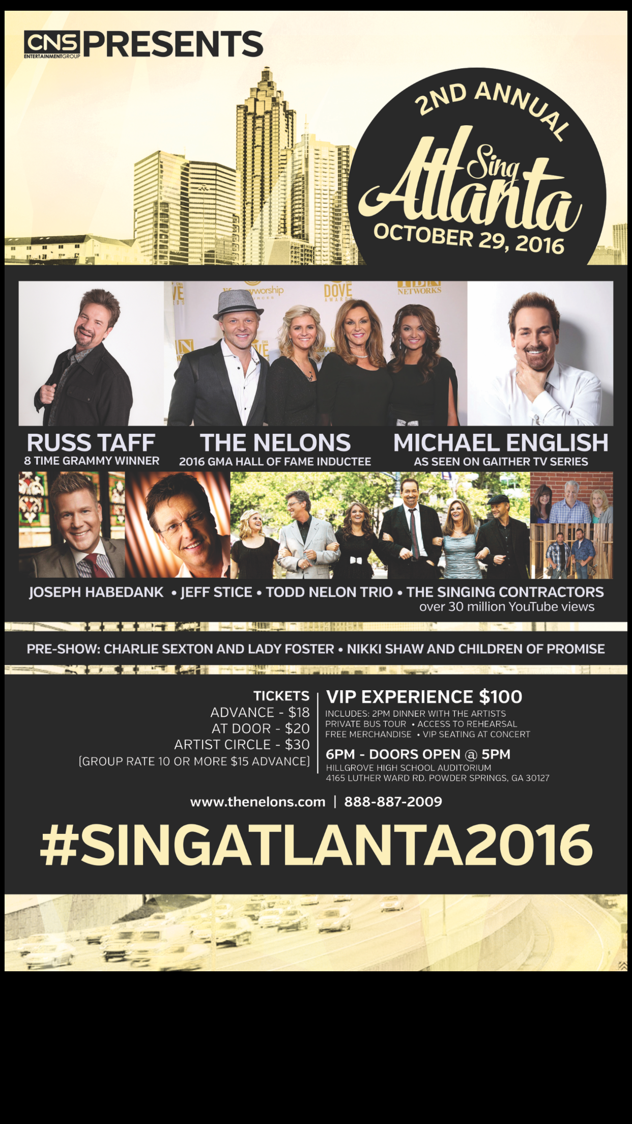 2nd Annual Sing Atlanta October 29th 2016 October 17, 2016 By SGN Scoops Staff 2nd Annual Sing Atlanta October 29th 2016 2nd Annual Sing Atlanta October 29th 2016 Call 888 887 2009 #SingAtlanta2016 Friday – Talent Search Saturday – Concert Share this: Click to share on Facebook (Opens in new window) Facebook Click to share on X (Opens in new window) X Click to share on Pinterest (Opens in new window) Pinterest Click to email a link to a friend (Opens in new window) Email Related