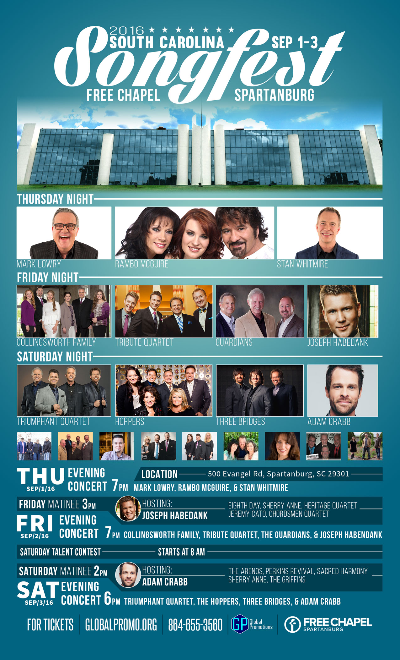 Thursday, September 1 st , 2016 through Saturday, September 3rd, 2016 at Free Chapel Spartanburg, 500 Evangel Road, Spartanburg, SC. South Carolina Songfest is jam packed with some of Southern Gospel’s finest artists such as Mark Lowry, Collingsworth Family, The Hoppers, The Guardians, Adam Crabb, Triumphant Quartet, Three Bridges, Tribute Quartet, Rambo McGuire, Joseph Habedank and Stan Whitmire.