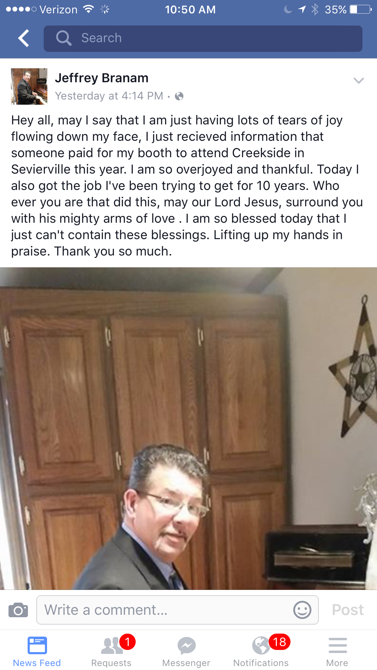 Jeff posted this morning on Facebook: Hey all, may I say that I am just having lots of tears of joy flowing down my face, I just recieved information that someone paid for my booth to attend Creekside in Pigeon Forge this year. I am so overjoyed and thankful. Today I also got the job I’ve been trying to get for 10 years. Who ever you are that did this, may our Lord Jesus, surround you with his mighty arms of love . I am so blessed today that I just can’t contain these blessings. Lifting up my hands in praise. Thank you so much.