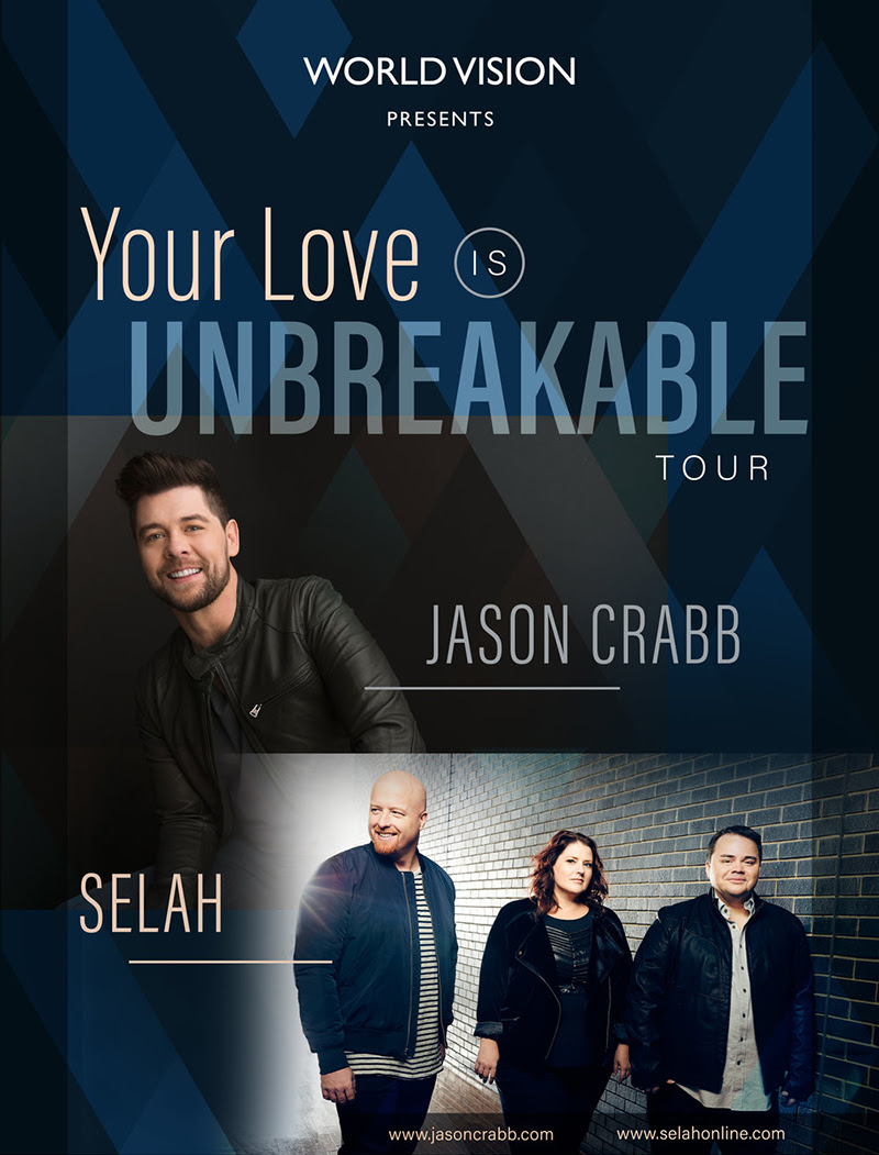 NASHVILLE, Tenn. – Sept. 22, 2017 – Grammy Award-winning artist Jason Crabb will join fellow GMA Dove Award-winners Selah on the Your Love Is Unbreakable Tour this fall. Presented by World Vision, the co-headlining tour kicks off Sept. 23, 2017, and is slated to hit 13 cities during the months of September, October and November.