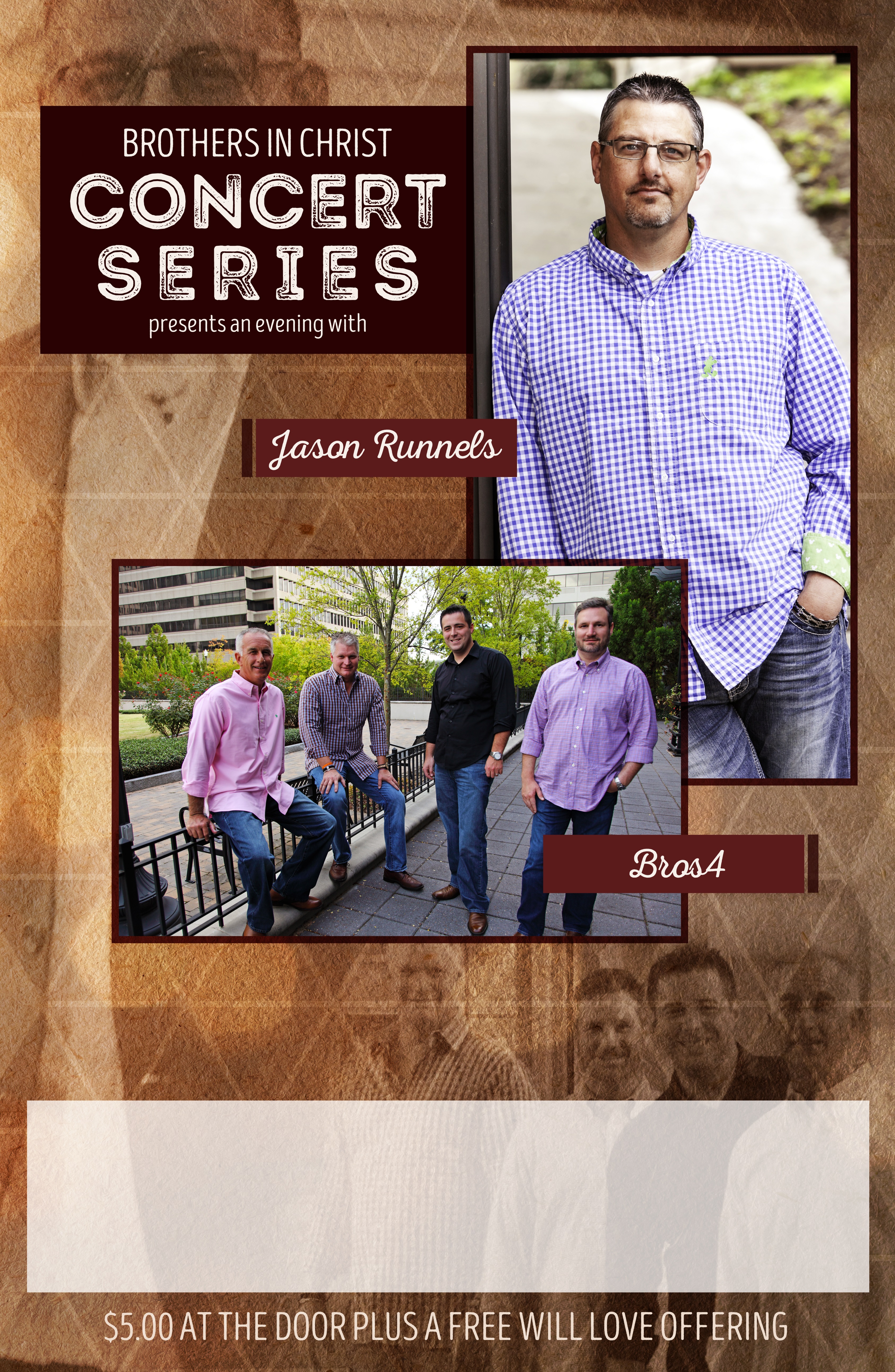 For more information call (601) 259-6553 or email, bros4@comcast.net. Additional details can also be found at www.bros4.net or www.jasonrunnelsministries.