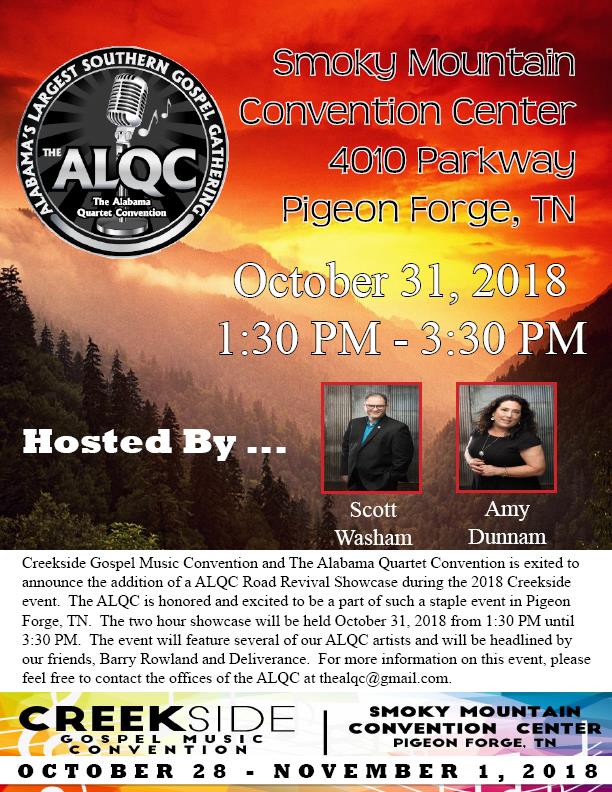 The Alabama Quartet Convention (ALQC) was founded by friends Scott Washam and Amy Dunnam in Mobile, Ala. The ALQC is a three night event hosting over 40 Southern gospel music groups. Two years ago, the Convention went on tour, known as the ALQC Road Revival. These events showcase six to ten