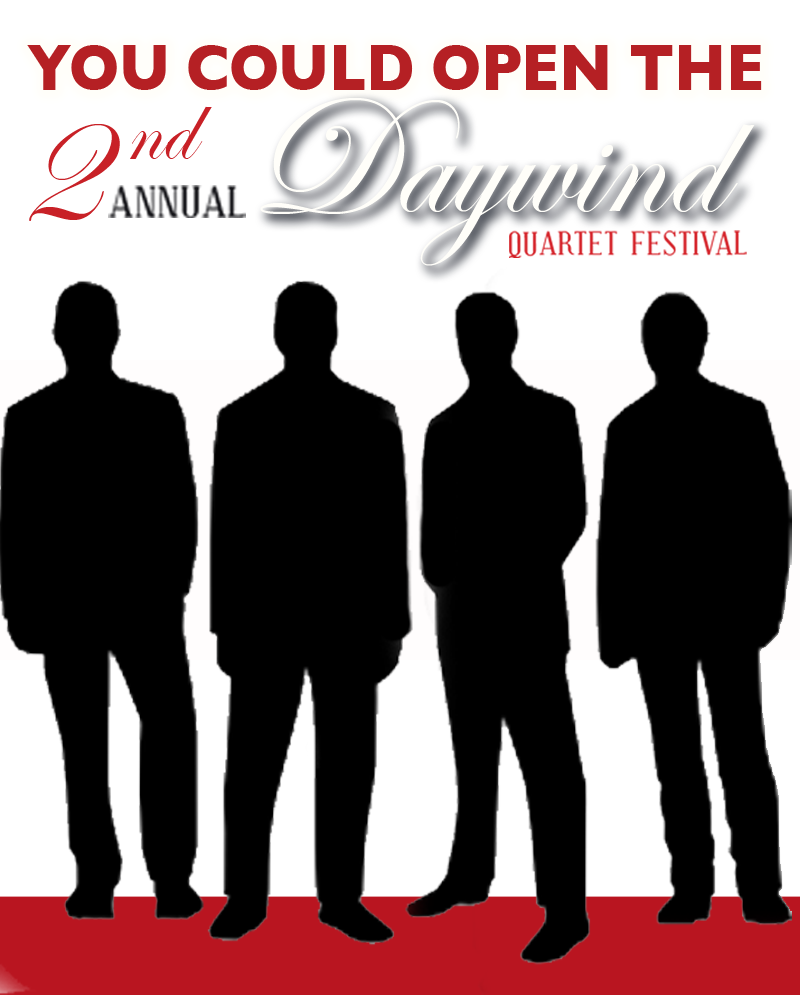 Daywind invites quartets from around the country to submit a video of an acappella performance of a public domain song (such as a hymn), up to 2 minutes in length, which Daywind will post onto its Daywind Records Facebook page. Quartets featured in the top five videos, as determined by number of Facebook likes, will be invited to perform at the Daywind Quartet Festival in April 2016! Attendees of the Quartet Festival will vote on their favorite quartet, and the winner will receive a 10-song soundtrack recording package from Daywind Studios.