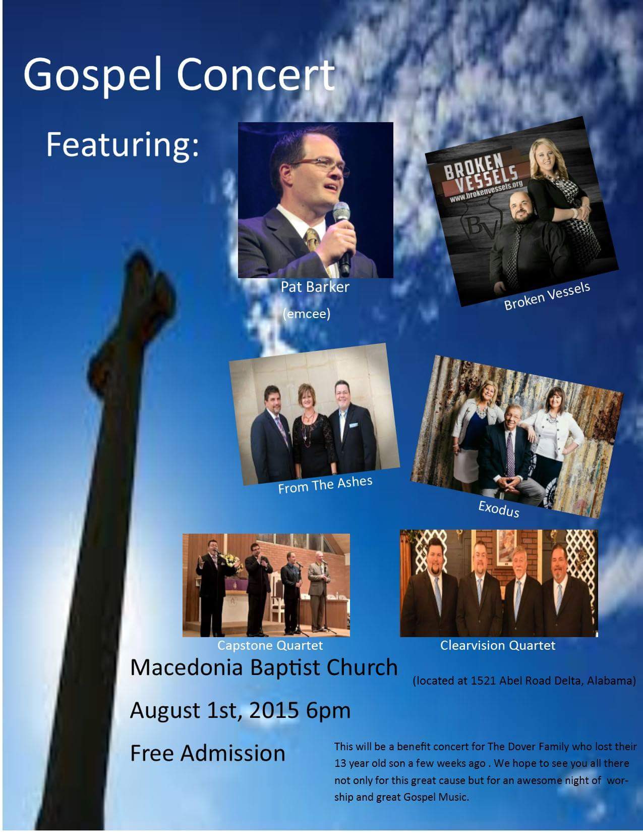 So come and be blessed with music provided by BROKEN VESSELS, FROM THE ASHES, EXODUS, CAPSTONE QT and CLEARVISION Â QT. Â A night of southern gospel music you certainly don’t want to miss!