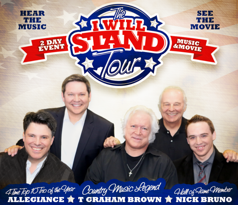 Following the recent release of  their Patriotic song, I Will Stand, popular trio Allegiance is proud to announce the I Will Stand Tour. This special tour finds them teaming up with SGMA Hall of Fame member, Nick Bruno, Country Music Legend, T Graham Brown, Patriotic organization Helping a Hero and Ben Graham Productions of the I Will Stand film. On most occasions, this tour will be a two day event featuring a concert on the first day and showing of the I Will Stand film the second. Proceeds will benefit Helping a Hero to build specialty homes for wounded Veterans.