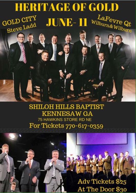 Make plans to join us Saturday, June 11 – 6:00 pm at Shiloh Hills Baptist Church, 75 Hawkins Store Road, Kennesaw, GA – Doors open at 5:00 – ADVANCE TICKETS $25.00 – TICKETS $5.00 MORE AT THE DOOR. If you want advance tickets you need to get that check in the mail today or tomorrow. Thursday you will have to use a credit card for advance tickets and there is a $1.00 service charge on each ticket. Call 770-617-0359