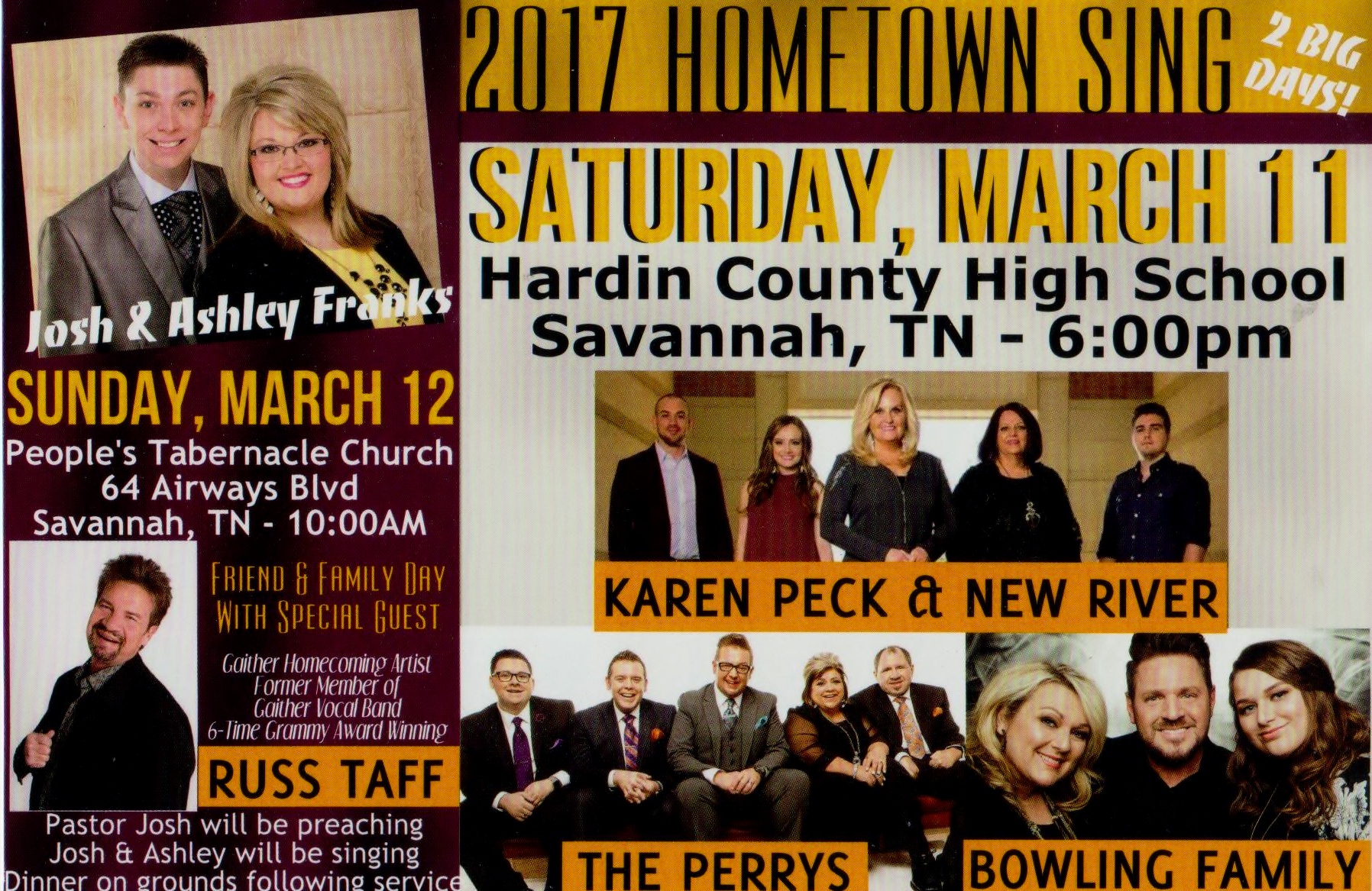 The Josh & Ashley Franks “HOMETOWN SING” will be held in Savannah, TN on Saturday Night, March 11th and Sunday, March 12th. The 6:00p.m., Saturday March 11 event, will be held at the Hardin County High School Auditorium. The one big super southern gospel night will showcase “KAREN PECK & NEW RIVER”, “THE PERRYS”, “THE BOWLING FAMILY”, and host group “JOSH & ASHLEY FRANKS”. Then on Sunday, March 12, at 10:00AM at People’s Tabernacle Church, 64 Airways Blvd, Pastor Josh & Ashley Franks will welcome special musical guest, Gaither Homecoming Artist, “RUSS TAFF”. Pastor Josh will be preaching and Josh & Ashley will be singing. Dinner on the grounds will follow the service. Doors will open one hour before each event. For more information, go to www.joshandashleyfranks.com