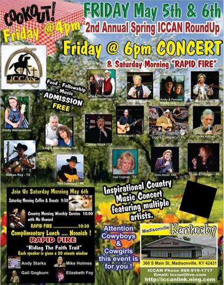 Excitement is in the air! We are all looking forward the upcoming ICCAN KY Round Up Conference. There will be great fellowship, good eatin’, music ministry and preaching of the Word “Rapid Fire”…don’t miss it. Come and be blessed….all ICCAN members and friends are invited to attend. No registration fee! For those who can stay over on Sunday…there will be fellowship on the lake at Mike Holmes home