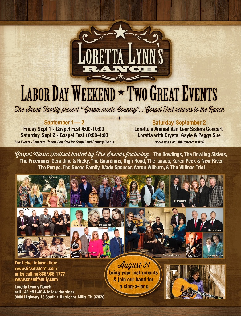 The highlight of the weekend will be a separate performance on Saturday, September 2, by the country music icon, Loretta Lynn along with the annual Van Lear Sisters Concert including Crystal Gayle and Peggy Sue. “This is where Gospel meets Country,†said Sneed. “Folks can enjoy two events in one location while enjoying the beauty of the Loretta Lynn Ranch on a holiday weekend,†he continued.