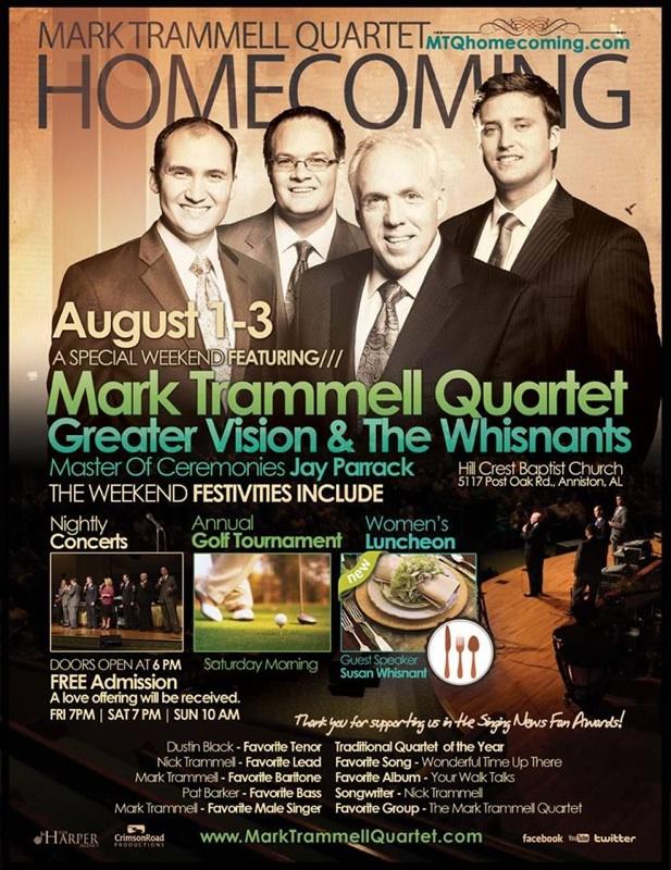 Mark Trammell Quartet Homecoming August 1 -3 July 28, 2014 By SGN Scoops Staff Mark Trammell Quartet Homecoming Find Out More Information About The Mark Trammell Quartet Homecoming Here Share this: Click to share on Facebook (Opens in new window) Facebook Click to share on X (Opens in new window) X Click to share on Pinterest (Opens in new window) Pinterest Click to email a link to a friend (Opens in new window) Email Related