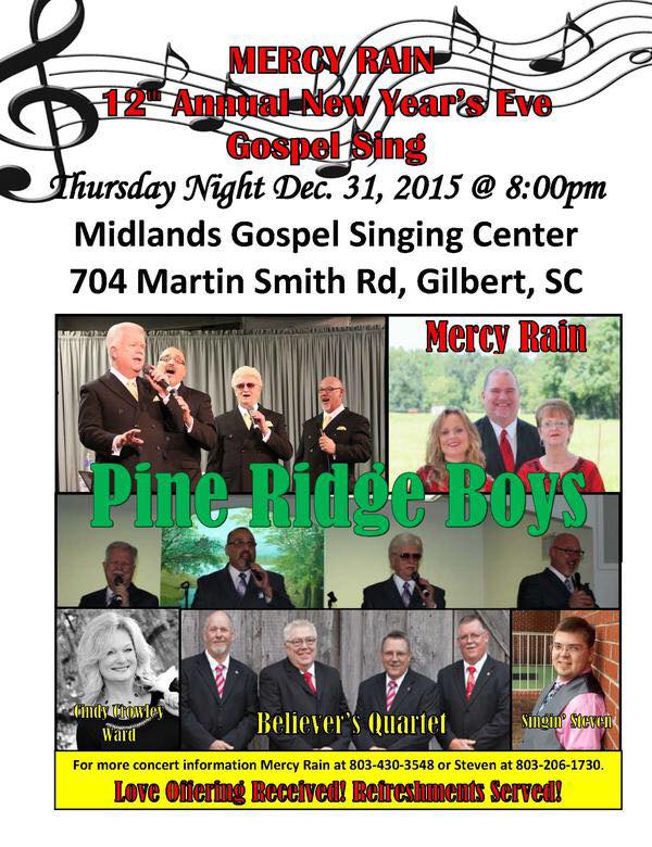 Make plans to join us for this years NEW YEARS EVE SING!! Featuring The Pine Ridge Boys, The Believers Quartet, Mercy Rain, Cindy Ward, and Singin Steven!! No better way to bring in the New Year!