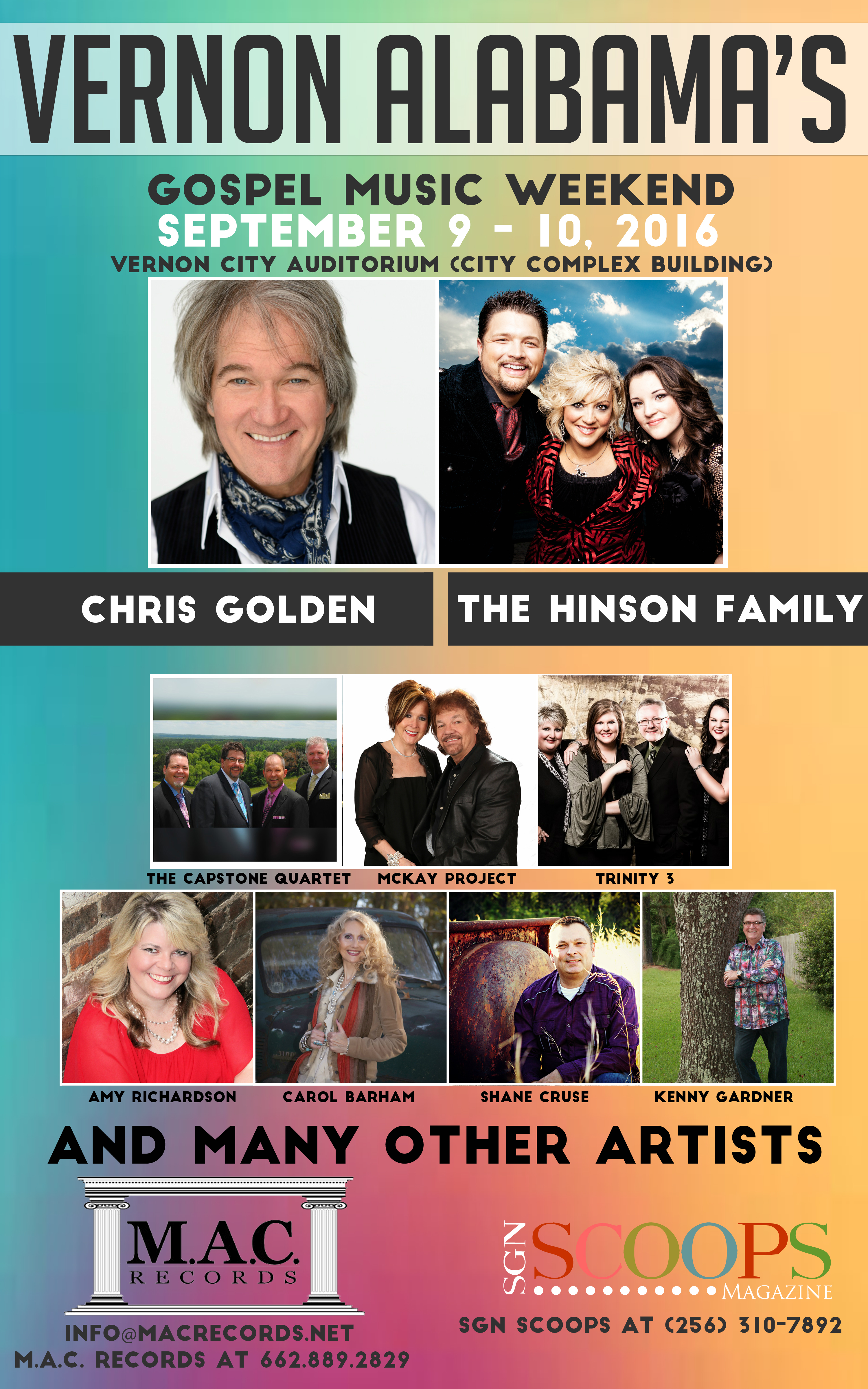 Vernon, AL – Rob Patz, Publisher of SGNScoops, along with Leslie and Dennis McKay of M.A.C. Records are pleased to announce the Vernon Alabama’s Gospel Music Weekend, September 9th and 10th in Vernon, Alabama.Â