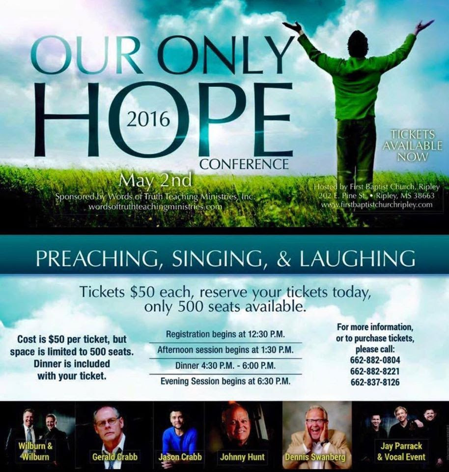 Ripley, MS – Words of Truth Teaching Ministries, Inc is excited to present the Our Only Hope 2016 Conference in Ripley, Mississippi on May 2, 2016. The one-day event will be hosted by First Baptist Church, Ripley.