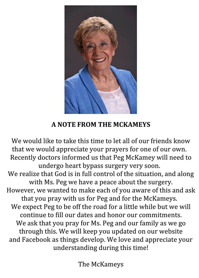 Please Pray For Peg McKamey December 22, 2017 By SGN Scoops Staff Please Pray For Peg McKamey Please Pray For Peg McKamey Find More Southern Gospel News HERE Share this: Click to share on Facebook (Opens in new window) Facebook Click to share on X (Opens in new window) X Click to share on Pinterest (Opens in new window) Pinterest Click to email a link to a friend (Opens in new window) Email Related