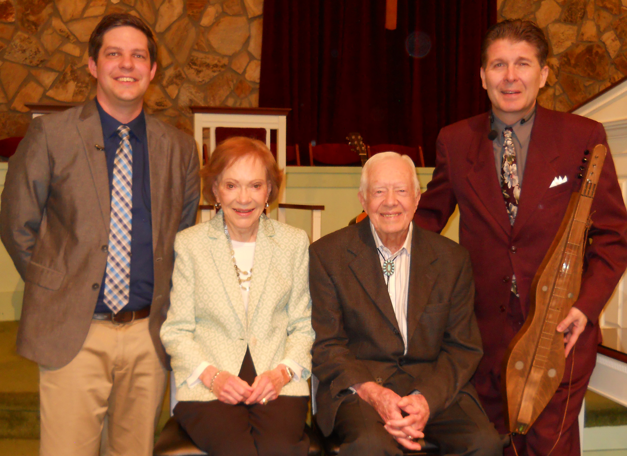 Pastor Jeremy Shoulta shared a musically-themed sermon entitled “Why Sing†based on Colossians 3:12-17. Franks blended his fiddling, guitar and Appalachian dulcimer sounds with songs and humorous stories intertwining with the message and congregational hymns. Hymns were led by music leader Danny Ariail and supported by Maranatha musicians Carol Anderson and Jan Williams. The congregation included worshippers from China, Japan, Australia, U.K., Canada and within the U.S. from Hawaii to Washington, D.C. Former President Jimmy Carter taught a lesson on King Solomon and then joined in worship with former First Lady Rosalynn Carter. Also among the congregation was National Park Service Director Jon Jarvis.