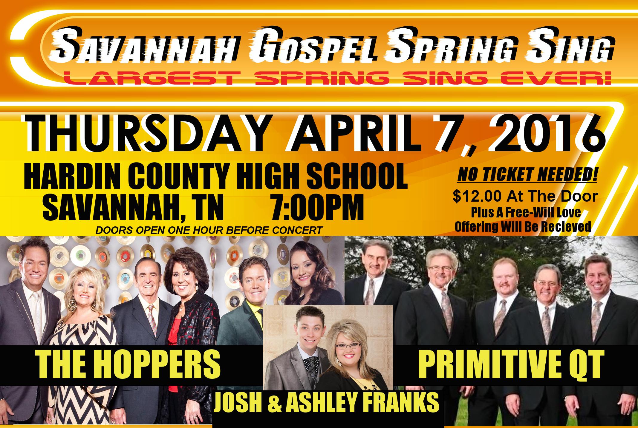 The annual “SAVANNAH GOSPEL SPRING SING” will be held on Thursday April 7, 2016 in Savannah, TN at the Hardin County High School Auditorium beginning at 7:00p.m. Josh & Ashley Franks will be hosting the event featuring, Gaither Homecoming Artist, THE HOPPERS, and one of gospel music’s premier bluegrass gospel groups, from Hominy Valley, PRIMITIVE QUARTET. There is no ticket needed. General Admission is $12.00 at the door, plus a special free-will love offering will be received. Doors will open one hour before concert. For more information, go to www.joshandashleyfranks.com.