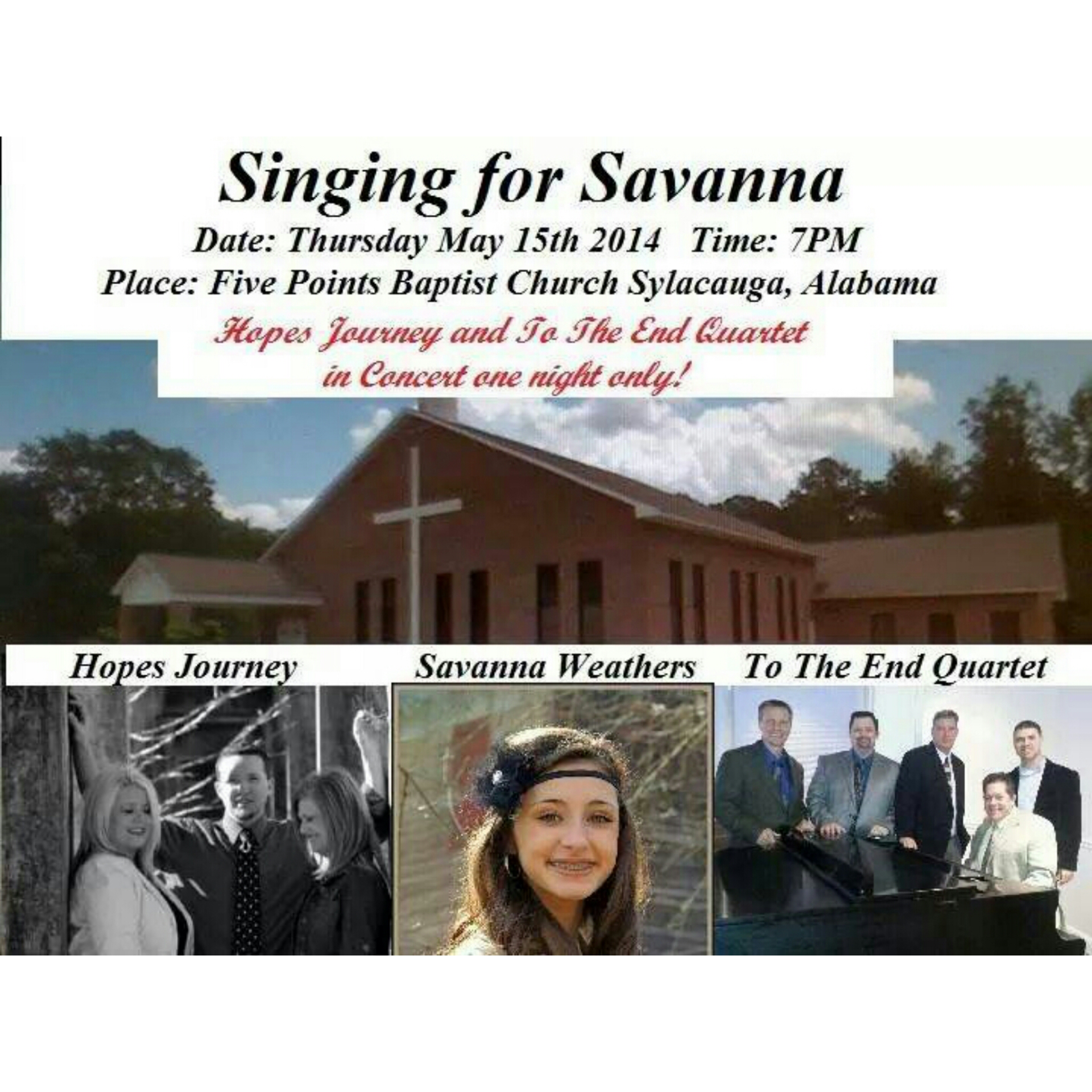 To The End Quartet would like to invite all who can to join us on Thursday night, May 15th at 7:00 PM. Join us for “Sing for Savanna”. Also present that night will be our incredible friends and trio “Hopes Journey”. This is a one night only concert in Sylacauga, Alabama. The location is Five Points Baptist Church. Savanna Weathers is a 13 year old young lady batteling bone cancer. She has been in and out of hospitals during this ordeal. Savanna at this time has no white blood cells to fight infections. She is a real trooper and so loves the Lord. TTE asks that if you are not able to attend that you please put Savanna along with her family on your church prayer list. If you’d like to make a donation to her fund you may do so at Heritage Bank in Sylacauga, Alabama