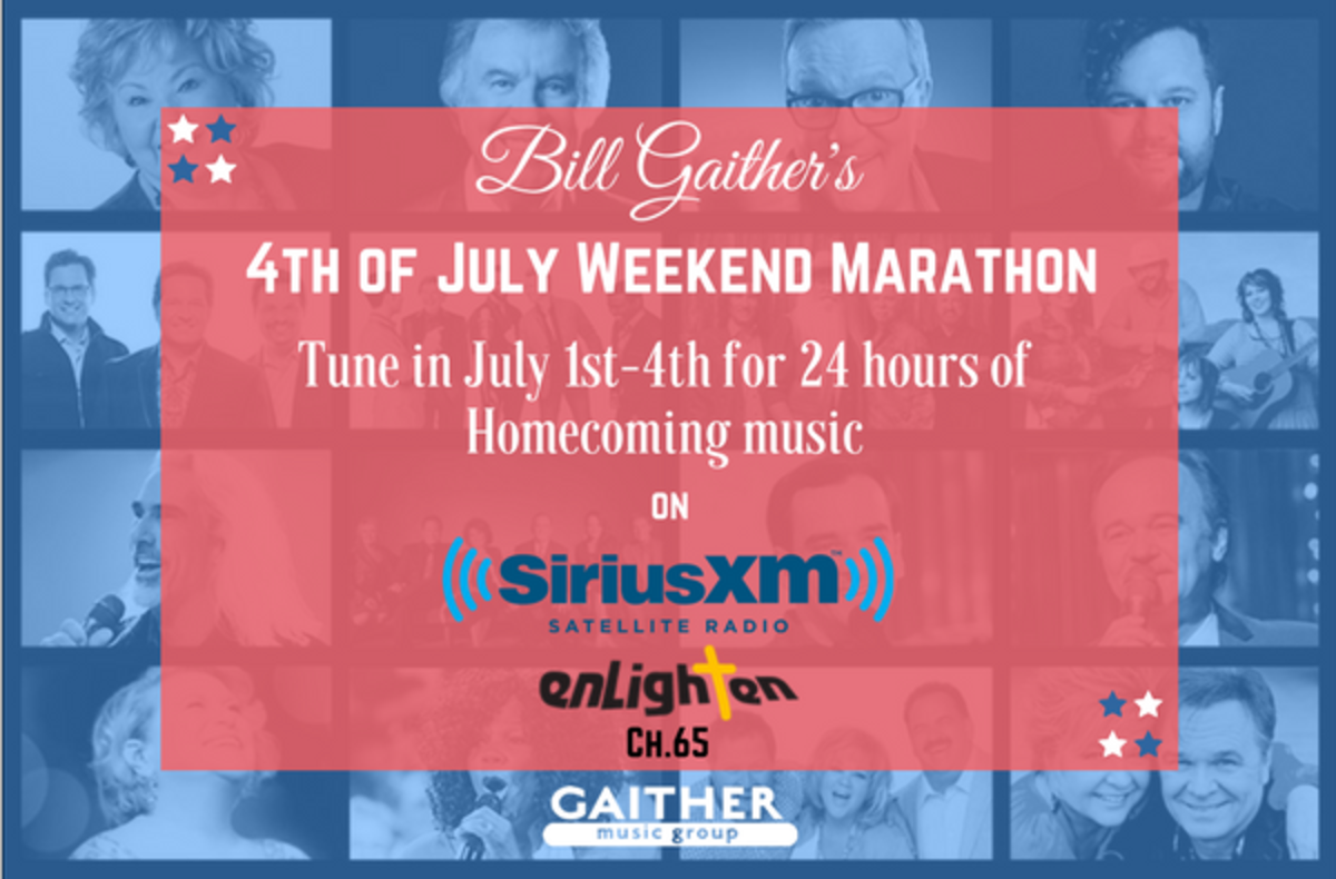 NASHVILLE, Tenn.–June 28th, 2017—Gaither Music Group and Sirius XM have joined hands for a special four-day event—Bill Gaither’s 4th of July Gaither HOMECOMING Weekend Marathon. From July 1st through July 4th, gospel music fans can tune into the enLighten channel (channel #65) throughout the day to hear many of their favorite HOMECOMING artists and songs. Â