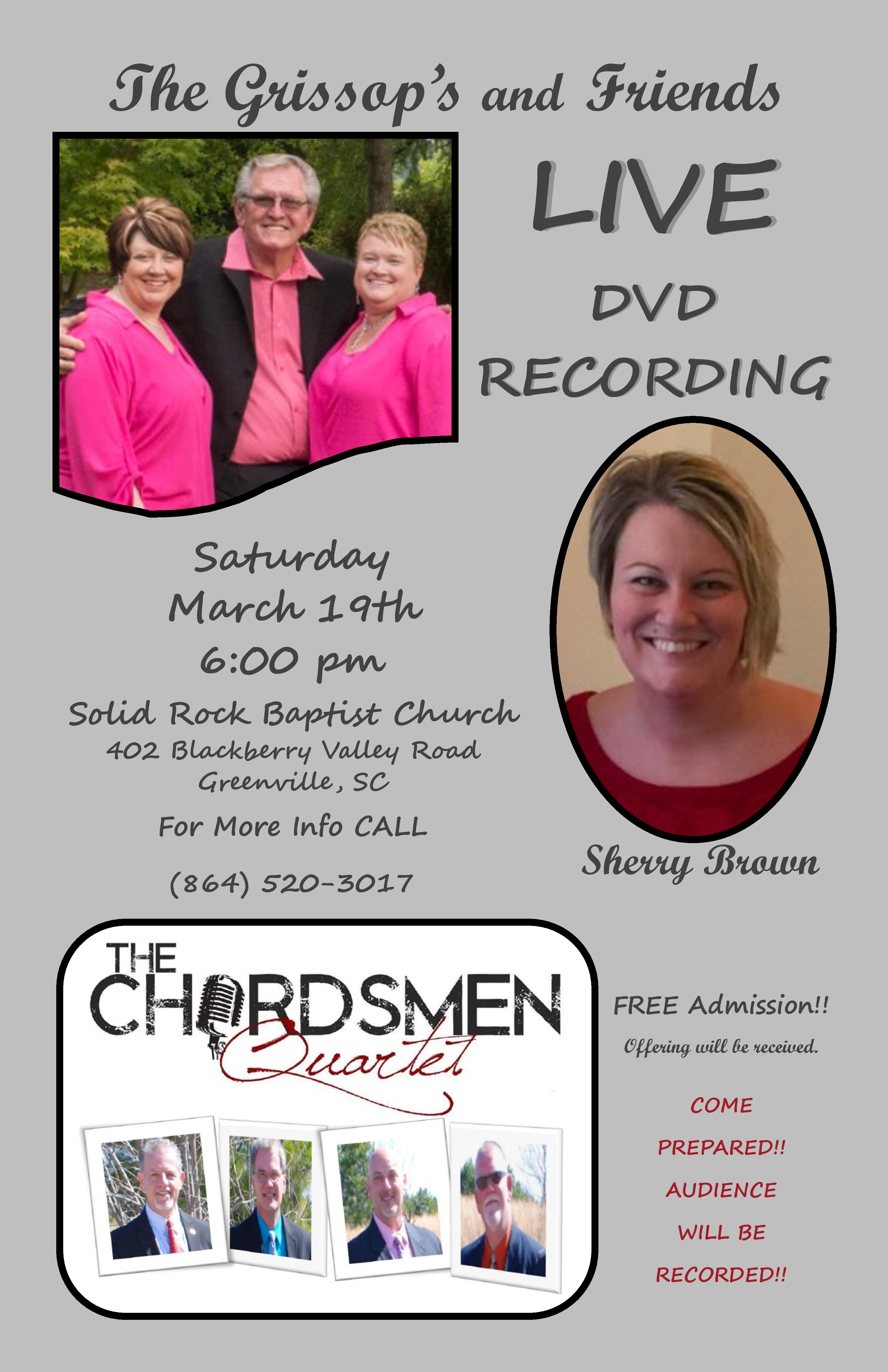 The Chordsmen Quartet: We would like to invite everyone to a special night of southern gospel singing and worship. Our friends The Grissop’s will be with us for this special night and we would love to share it with all of our family and friends. If you have any questions please call the number on the poster or call me, Jerry at 864-346-0449.se call the number on the poster or call me, Jerry at 864-346-0449.