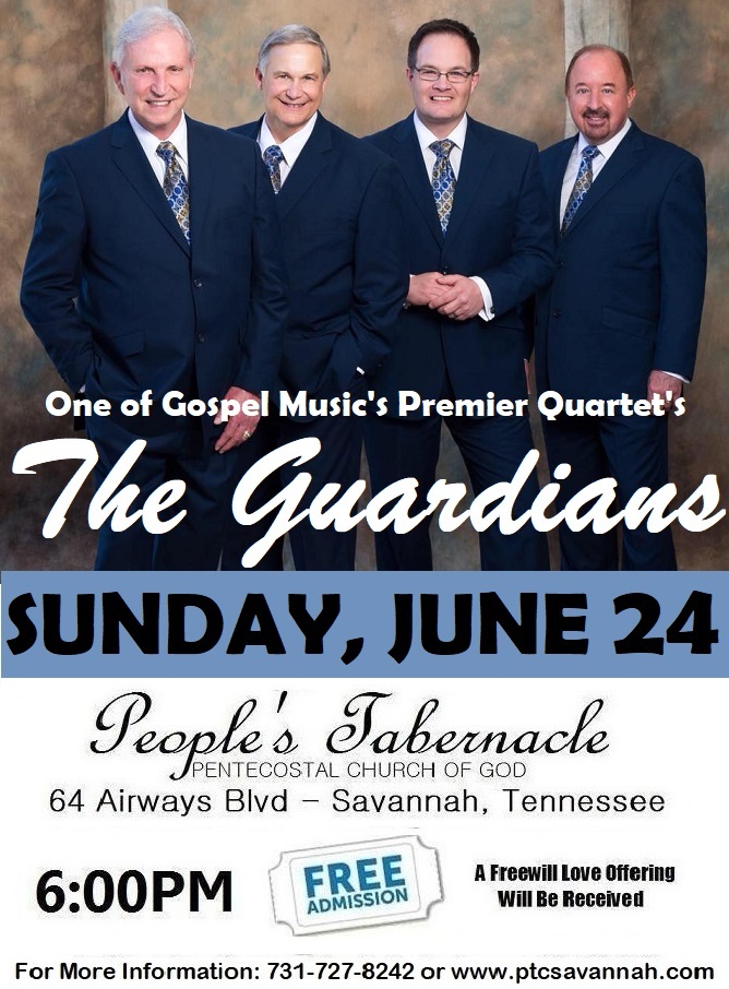 People’s Tabernacle Church, 64 Airways Blvd, Savannah, TN will welcome one of gospel music’s premier quartets, “THE GUARDIANS” with bass vocalist Pat Barker, on Sunday, June 24, 2018 at 6:00PM. They recently had the #1 hit song in gospel music, “Present in the Presence of the King”. Pastor Josh & Ashley Franks will also appear. For more information, go to www.joshandashleyfranks.com