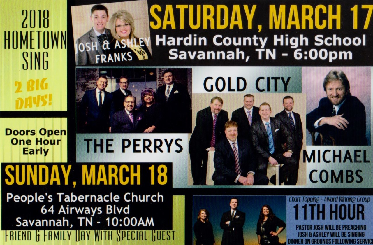 The Josh & Ashley Franks “HOMETOWN SING” will be held Saturday Night, March 17th at the Hardin County High School in Savannah, Tennessee. The 6:00p.m., one big super southern gospel night showcases gospel music’s most awarded quartet, “GOLD CITY”, one America’s favorite mixed quartets, “THE PERRYS”, and singer/songwriter, “MICHAEL COMBS”. Doors will open one hour before the concert. For more information call 731-607-1948 or visit www.joshandashleyfranks.com