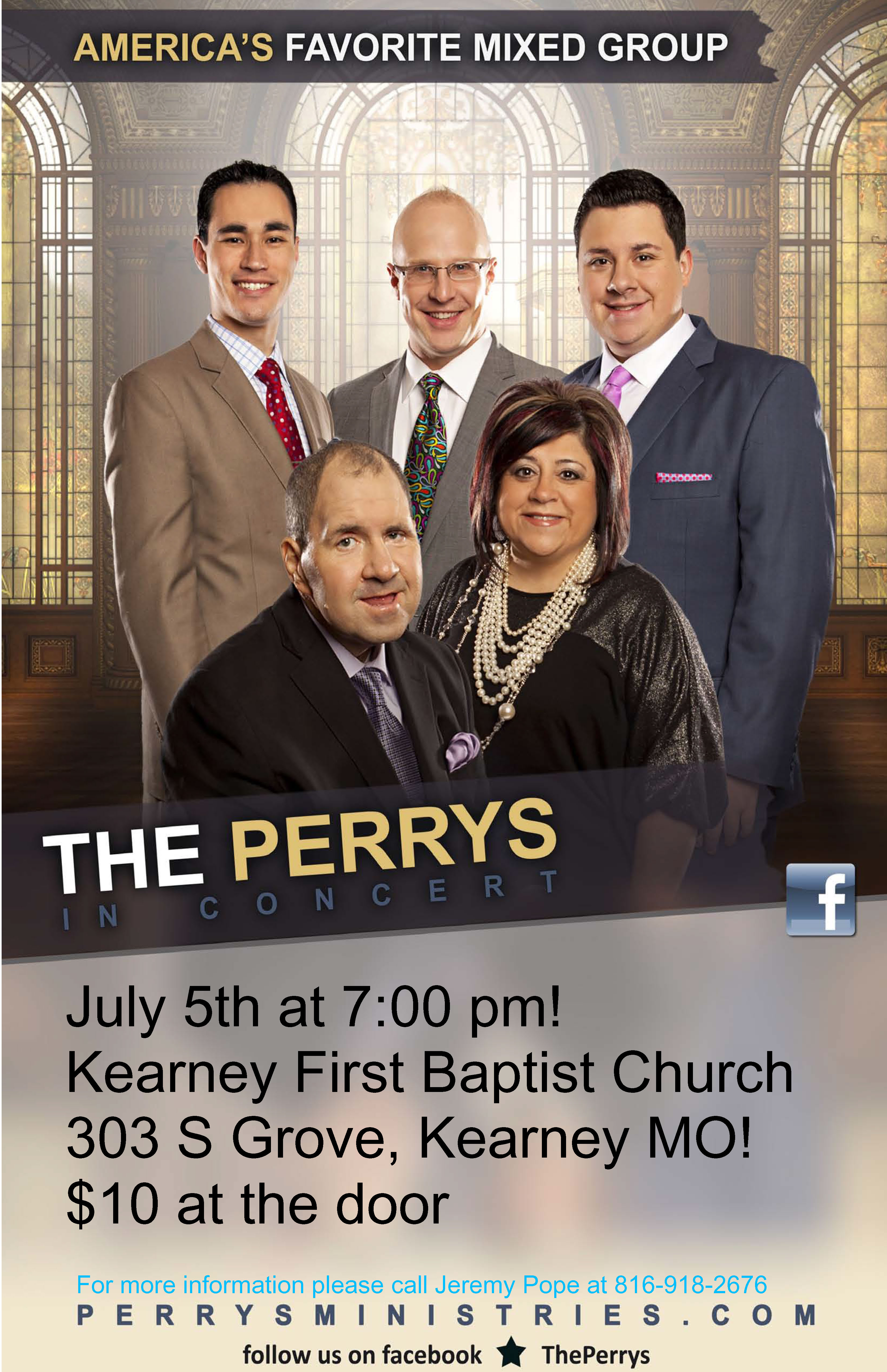 The Perry’s at First Baptist Church in Kearney MO June 18, 2014 By SGN Scoops Staff Please come see The Perry’s at First Baptist Church in Kearney MO on the 5th of July at 7:00 pm. Admission is $10 at the door. For more information please call Jeremy Pope at 816-918-2676 Share this: Click to share on Facebook (Opens in new window) Facebook Click to share on X (Opens in new window) X Click to share on Pinterest (Opens in new window) Pinterest Click to email a link to a friend (Opens in new window) Email Related