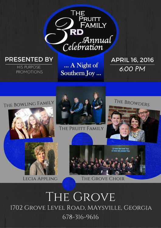 Joining the Pruitts for this exciting night will be award winning groups The Browders and The Bowling Family, two groups who know how to bring the message of the Gospel in fresh and electrifying ways. Special guests are Lecia Appling, and The Grove Choir.