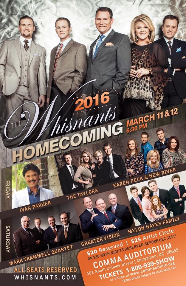 From The Whisnants Just a reminder about our Homecoming Sing March 11 & 12 2016. We’re really excited about the talent we have lined up. Tickets are selling so take advantage of buying both nights at a discount price until Dec 31st. You can also order tickets at www.commaonline.org. Thanks so much…help us get the word out by sharing this post. Blessings!