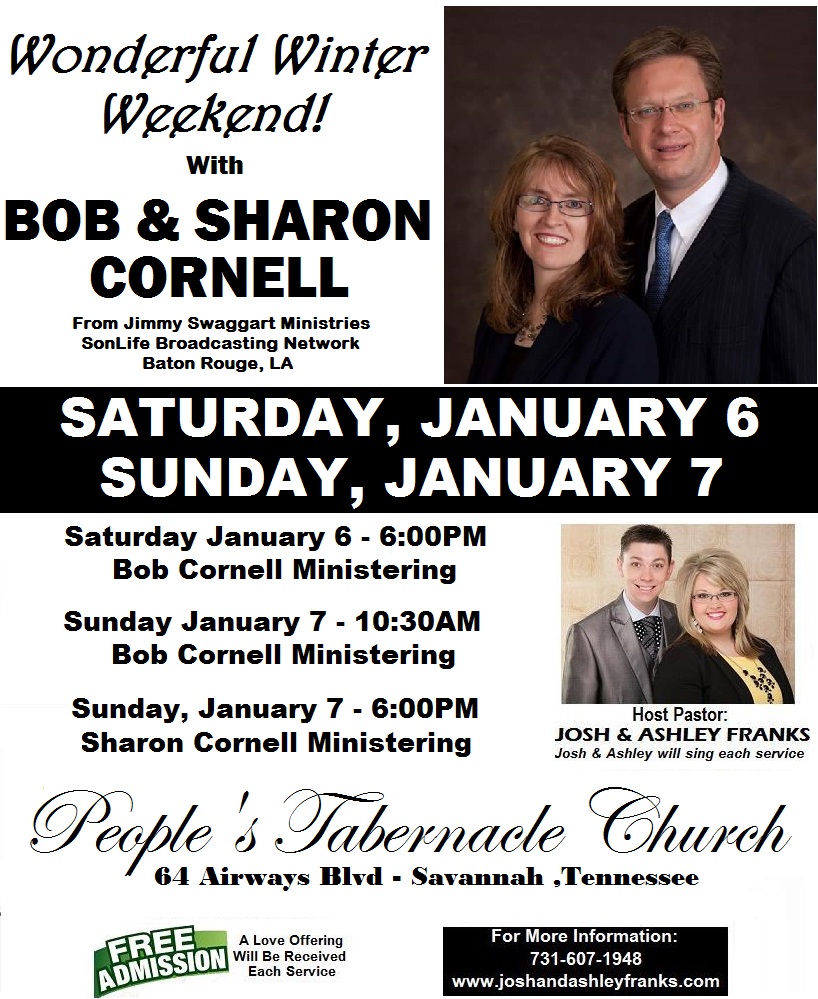 People’s Tabernacle Church, 64 Airways Blvd, Savannah, TN will host a Wonderful Winter Weekend with “BOB & SHARON CORNELL” from Jimmy Swaggart Ministries and SonLife Broadcasting Network from Baton Rouge, LA. Services will be on Saturday, January 6, 2018 at 6:00PM and Sunday, January 7, 2018 at 10:30AM & 6:00PM. Pastor Josh & Ashley Franks will also appear. For more information, go to www.joshandashleyfranks.com